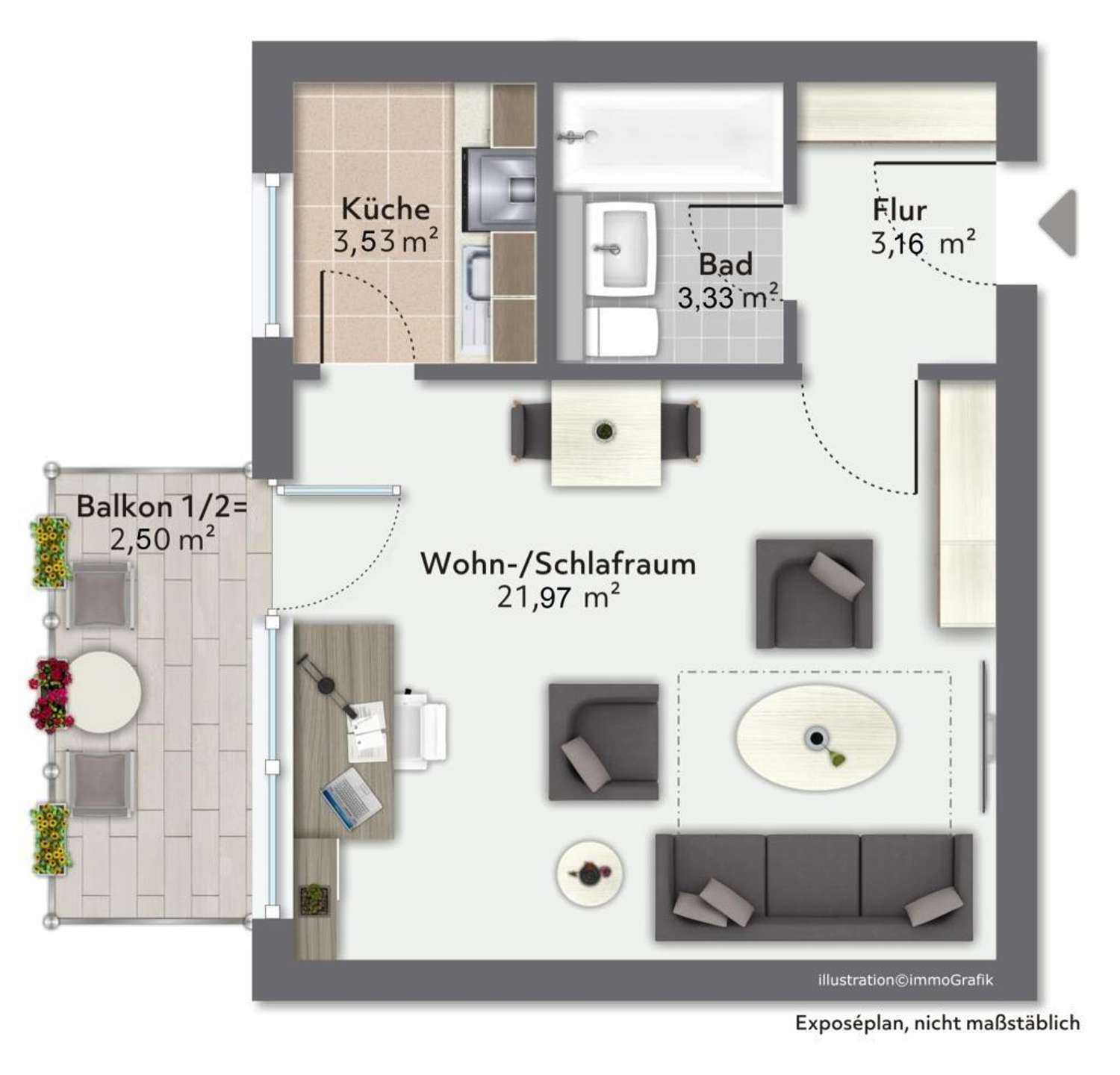 Die überaus helle Wohnung befindet sich im Erdgeschoss bzw. Hochparterre und teilt sich in ein großes Wohn-/Schlafzimmer, eine separate komplett eingerichtete Küche mit Fenster, Flur mit Garderobennische und ein weiß gefliestes Wannenbad mit WC und Waschbecken auf. Vom Wohnzimmer aus gelangen Sie auf den sanierten Balkon mit Blick in den Westen – zum Innenhofbereich der Wohnanlage.