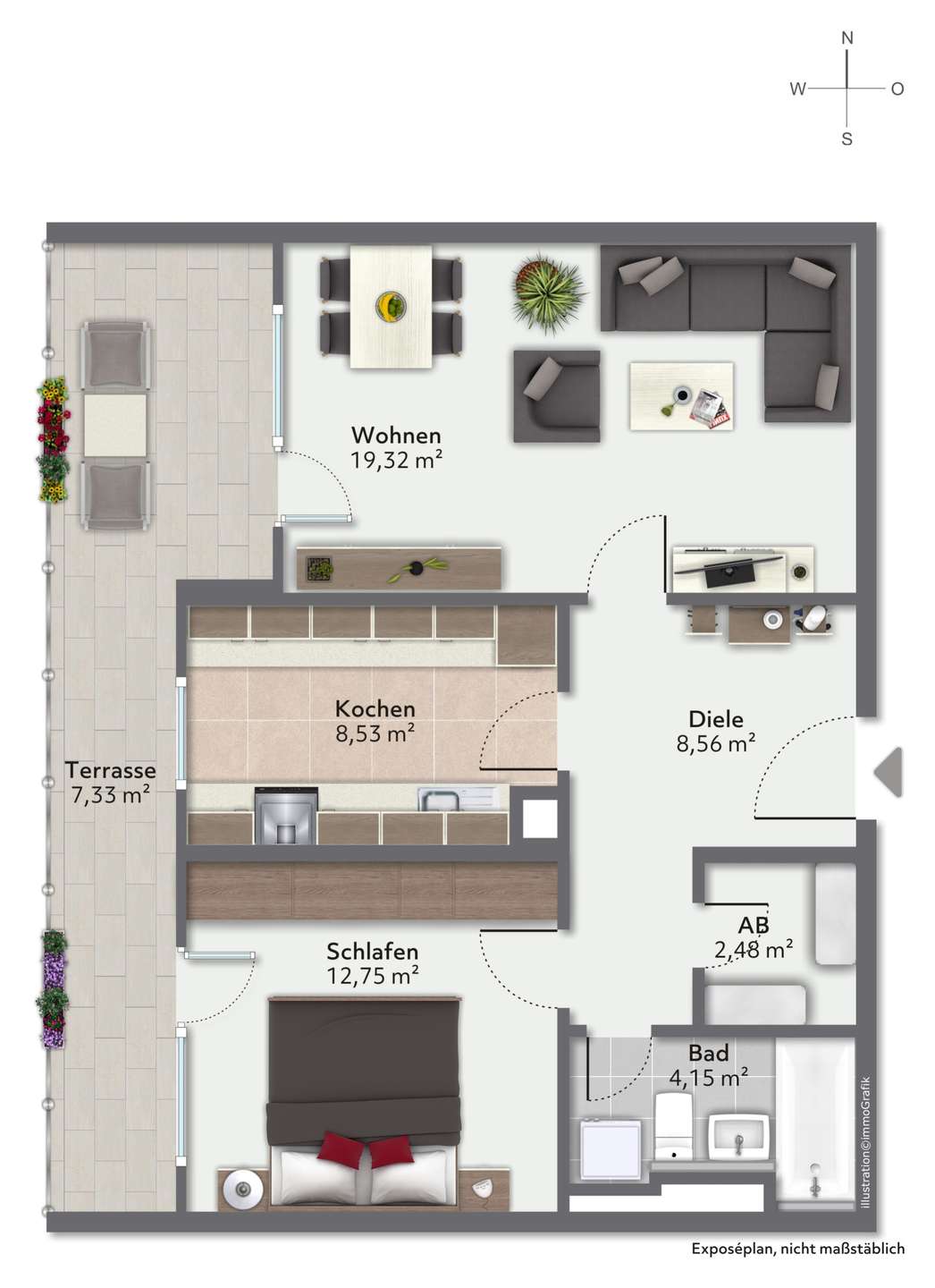 Das helle Wohnzimmer bietet direkten Zugang zur weitläufigen, nach Westen ausgerichteten Terrasse. Auch das Schlafzimmer verfügt über einen eigenen Terrassenzugang und schafft dadurch eine besonders angenehme Wohnatmosphäre. Die Küche überzeugt mit schönem Gartenblick und ausreichend Platz für eine gemütliche Essecke. Das Badezimmer ist mit einer Dusche sowie einem Waschmaschinenanschluss ausgestattet. Durch die praktische Abstellkammer wird zusätzlicher Stauraum geboten.