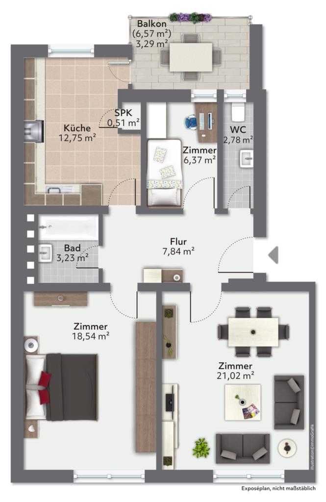 Die im 1. Obergeschoss gelegene Wohnung ist wie folgt aufgeteilt: Ein geräumiger Eingangsbereich, ein helles Wohnzimmer, ein Schlafzimmer, ein kleines Zimmer mit ca. 6,5 m², ein innenliegendes Badezimmer, ein WC mit Fenster und eine große Wohnküche. Von der Wohnküche aus, die mit einer praktischen Abstell- bzw. Speisekammer ausgestattet ist, haben Sie Zugang zur West-Loggia mit Ausrichtung zum ruhigen Innenhof. Das kleine Zimmer mit Fenster zur Westseite eignet sich sehr gut als Gästezimmer oder Büro.