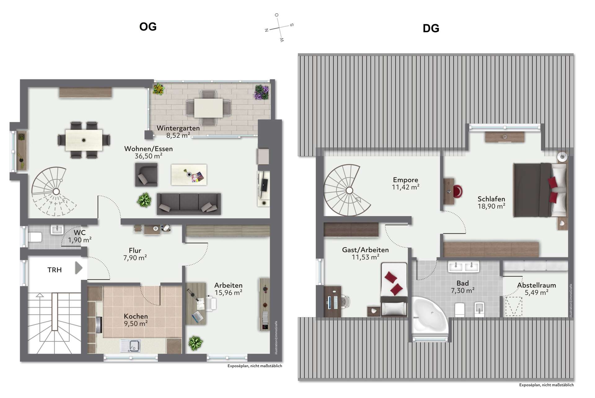 Über eine Wendeltreppe gelangen Sie in das Dachgeschoss, das als angenehme Rückzugsoase dient. Hier erwartet Sie ein großzügiges Schlafzimmer, ein weiteres Kinder- oder Arbeitszimmer sowie ein luxuriöses Bad mit Eckbadewanne, Dusche und Bidet. Vom Bad aus ist noch ein Ankleidezimmer zu begehen. Dieses könnte auch vom Schlafzimmer aus erschlossen werden. Ein über die gesamte Hauslänge verlaufender Speicher bietet wertvollen Stauraum.