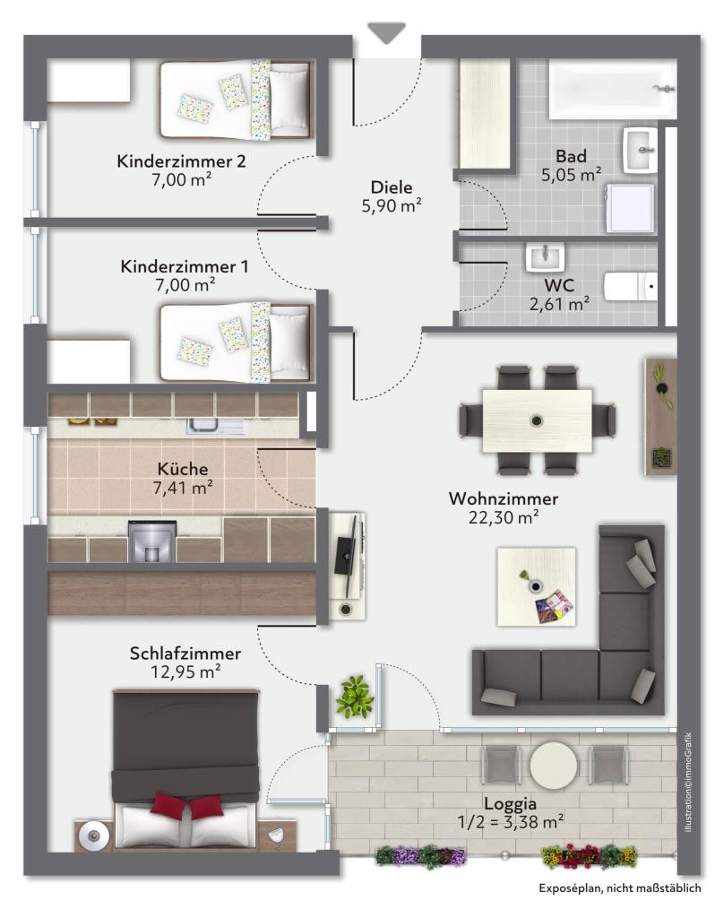 Als 100%ige Tochtergesellschaft der Münchner Bank eG bieten wir Ihnen im Alleinauftrag diese renovierungsbedürftige 4-Zimmer-Wohnung an. Sie befindet sich im 6. Obergeschoss von insgesamt acht Etagen eines gepflegten Mehrfamilienhauses aus dem Jahr 1973.Die geräumige Diele mit Abstellnische erschließt zwei kleinere Zimmer mit jeweils ca. 7 m² und das Wannenbad sowie das separierte WC mit Waschbecken. Das Wohnzimmer ist aufgrund der nach Westen ausgerichteten Fensterfront schön hell – von hier aus sind die separate Küche mit Tageslicht, das ca. 13 m² große Schlafzimmer sowie die verglaste Loggia begehbar, die sich über die gesamte Wohnzimmerbreite (ca. 4,50 m) erstreckt.