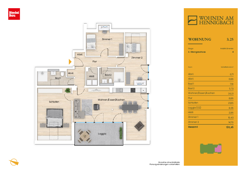 Bei allen Visualisierungen handelt es sich um unverbindliche Darstellungen aus Sicht des Illustrators. Die Grundrisse sind nicht zur Maßentnahme geeignet. Dargestellte Möbel in allen Wohnräumen sowie im Bad und Kücheneinbauten sind beispielhaft.