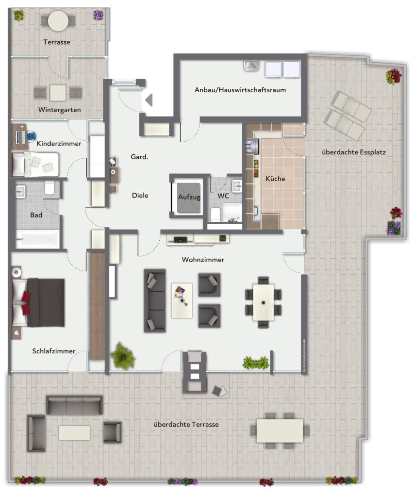 Die Wohnung verfügt über einen guten Schnitt, der ideal für Singles oder Pärchen mit großem Platzbedarf geeignet ist. Die Wohnung besteht aus einem großen Wohn-/Esszimmer, Küche, Flur-/Eingangsbereich, zwei Badezimmern, Arbeitszimmer und einem geräumigen Schlafzimmer. Nachträglich wurden ein Kaltwintergarten und ein nicht heizbarer Hauswirtschaftsraum im Bereich der nördlichen Dachterrassen angebaut. Die verbleibenden Terrassenflächen sind nach Osten und Süden ausgerichtet. Auf der Nord-Ostseite hat man einen freien Blick über die Dächer Sendlings bis hinein in die City von München. Zur Wohnung gehören noch ein Kellerabteil sowie ein Tiefgaragen-Einzelstellplatz.
