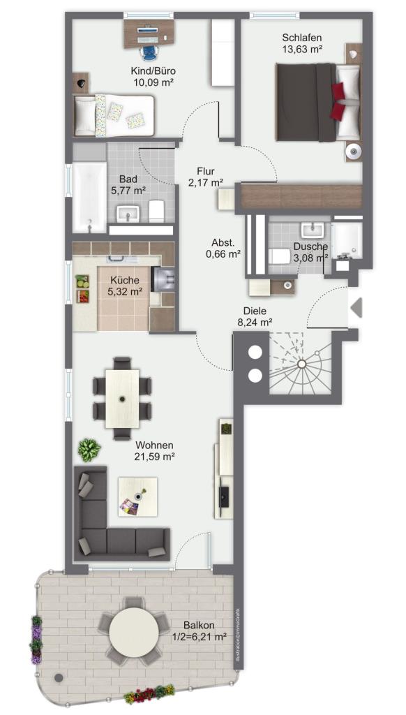 - Balkon (ca. 13,42 m²) – Ausrichtung: Westen
