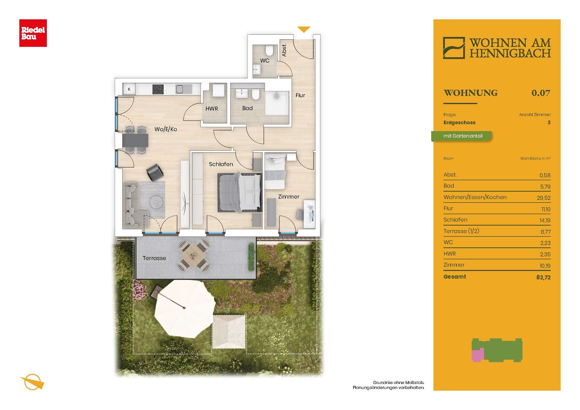 Im ortsbekannten Neubauprojekt „Wohnen am Hennigbach“ erwartet Sie diese moderne und nahezu barrierefreie 3-Zimmer-EG-Wohnung mit ca. 83 m² Wohnfläche. Die Wohnung überzeugt durch eine durchdachte Raumaufteilung, eine offene Wohnküche sowie hochwertige Ausstattungsdetails und bietet viel Platz für Paare, kleine Familien oder das Arbeiten im Homeoffice.Der großzügige, lichtdurchflutete Wohn- und Essbereich mit offener Küche bildet das Herzstück der Wohnung und bietet direkten Zugang zur sonnigen West-Terrasse – ideal zum Entspannen und Genießen. Große Fensterflächen mit Blick ins "Grüne" sorgen für eine angenehme Wohnatmosphäre und viel Tageslicht.