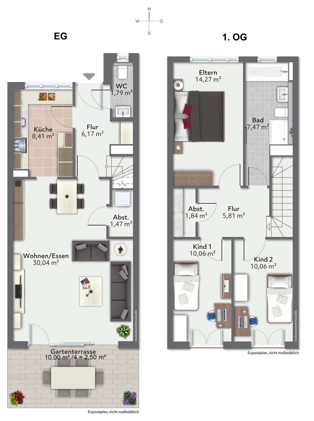 Die Wohnung erstreckt sich über Erd- und Obergeschoss. Im Erdgeschoss befinden sich ein ca. 30 m² großes, lichtdurchflutetes Wohn-/Esszimmer mit wandbreiten Fensterflächen, eine voll ausgestattete separate Küche, ein Gäste-WC, eine Abstellkammer mit WM-Anschluss sowie eine Diele mit Platz für einen Garderobenschrank. Vom Wohnzimmer aus gelangen Sie auf die sonnige, uneinsehbare Süd-Terrasse mit elektrischer Markise. Der anschließende, ca. 50 m² große Gartenanteil mit Zugang zum Innenhof bildet eine schöne, grüne Ruheoase.