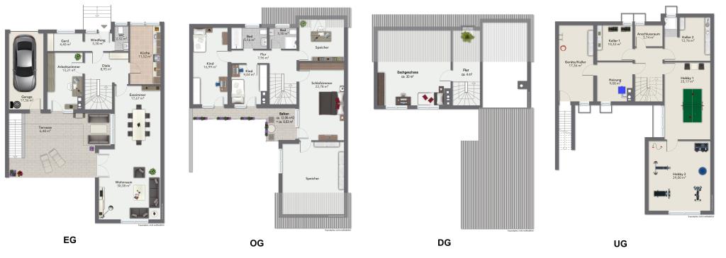 Im EG befinden sich der Eingangsbereich mit separater, heller Garderobe, ein Gäste-WC, ein Arbeits-/Gästezimmer sowie die Küche. Das angrenzende Esszimmer ist zum Wohnzimmer hin offen und verfügt über eine große Fensterfront zur weitläufigen, teilweise überdachten Terrasse mit Außenkamin. Im OG befinden sich das Schlafzimmer mit zwei direkt verbundenen, ausgebauten Speicherzimmern (bisher teilweise als Ankleidezimmer genutzt), zwei Kinderzimmer sowie zwei Tageslichtbäder (eines mit Wanne und eines mit Dusche ausgestattet). Von sämtlichen Zimmern im OG hat man Zugang zum Balkon. Das DG ist als Dachstudio ausgebaut. Im Bereich des Flurs ist u. U. der Einbau eines kleinen WC´s/ Bade-zimmers möglich.
