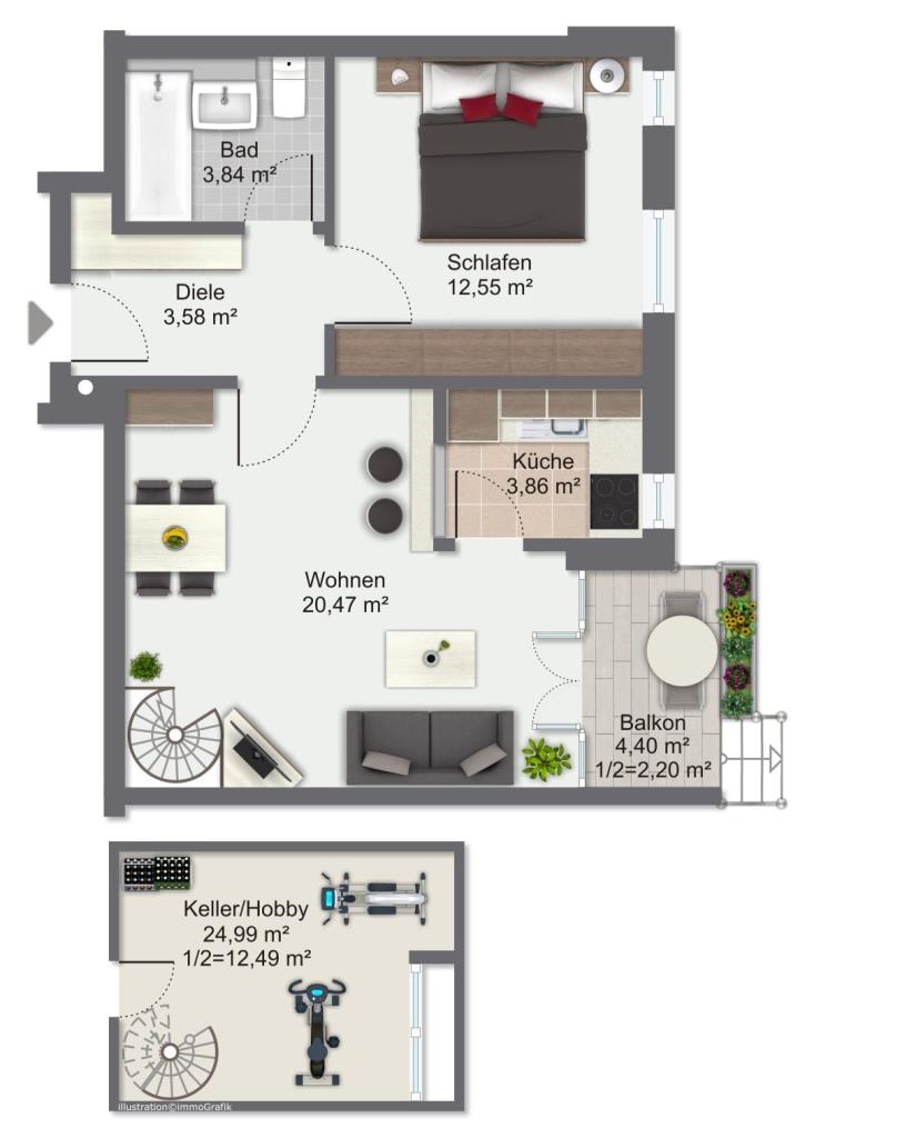 Der helle Hobbyraum ist über eine Wendeltreppe vom Wohnzimmer aus begehbar.