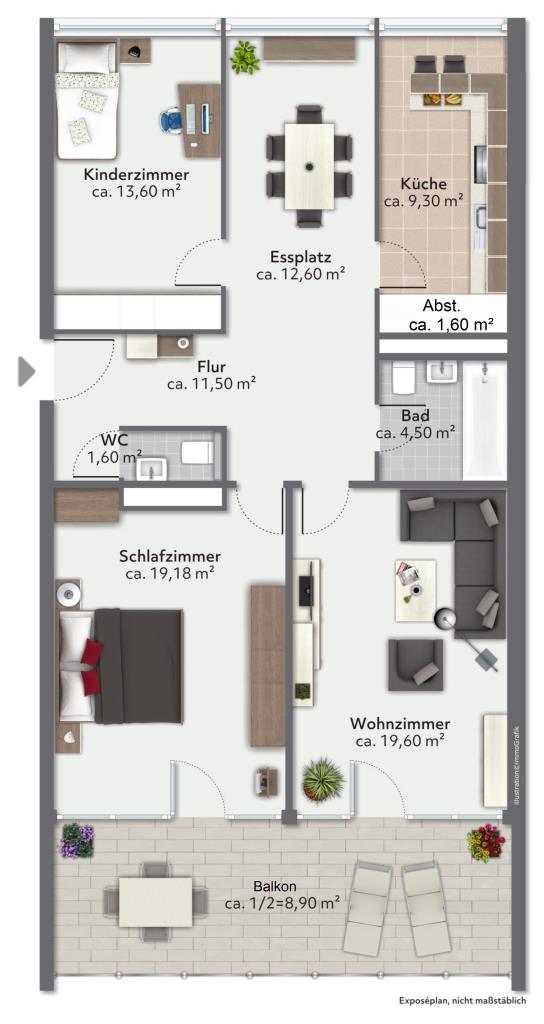 Die Wohnung ist aktuell als 3,5-Zimmer-Wohnung konzipiert und besteht aus Wohnzimmer, zwei Schlafzimmern, einer abgeschlossenen Küche mit danebenliegender hellen Essdiele sowie Flur, Bad und Gäste-WC. Das größere Schlafzimmer war früher in 2 Kinderzimmer aufgeteilt, was problemlos wieder herstellbar wäre. Auch könnte der aktuell offene Essbereich zu einem separaten Zimmer abgetrennt werden. Es wäre also auch eine 5-Zimmer-Wohnung möglich. Der ca. 18 m² große Balkon bietet eine spektakuläre Aussicht und kann mit einer vorhandenen Markise verschattet werden.