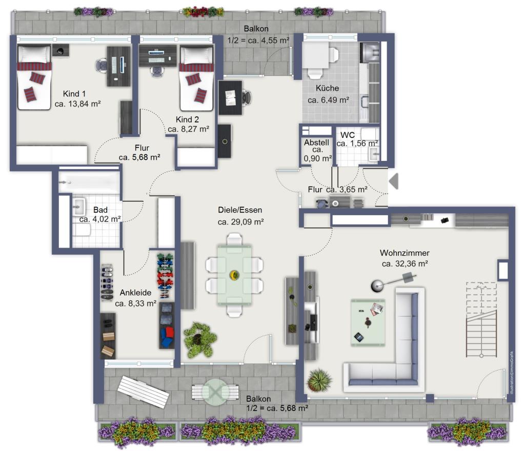 Highlight ist hier der nach Süden ausgerichtete Wohnraum mit einer Galerie und somit ca. 5 m Raumhöhe. Eine große Fensterfront bietet Ihnen einen lichtdurchfluteten Raum und eine grandiose Aussicht bis in die Berge. Vor dem Essbereich befindet sich ein ca. 11,5 m² großer Südbalkon, ebenfalls mit Blick bis in die Alpen.