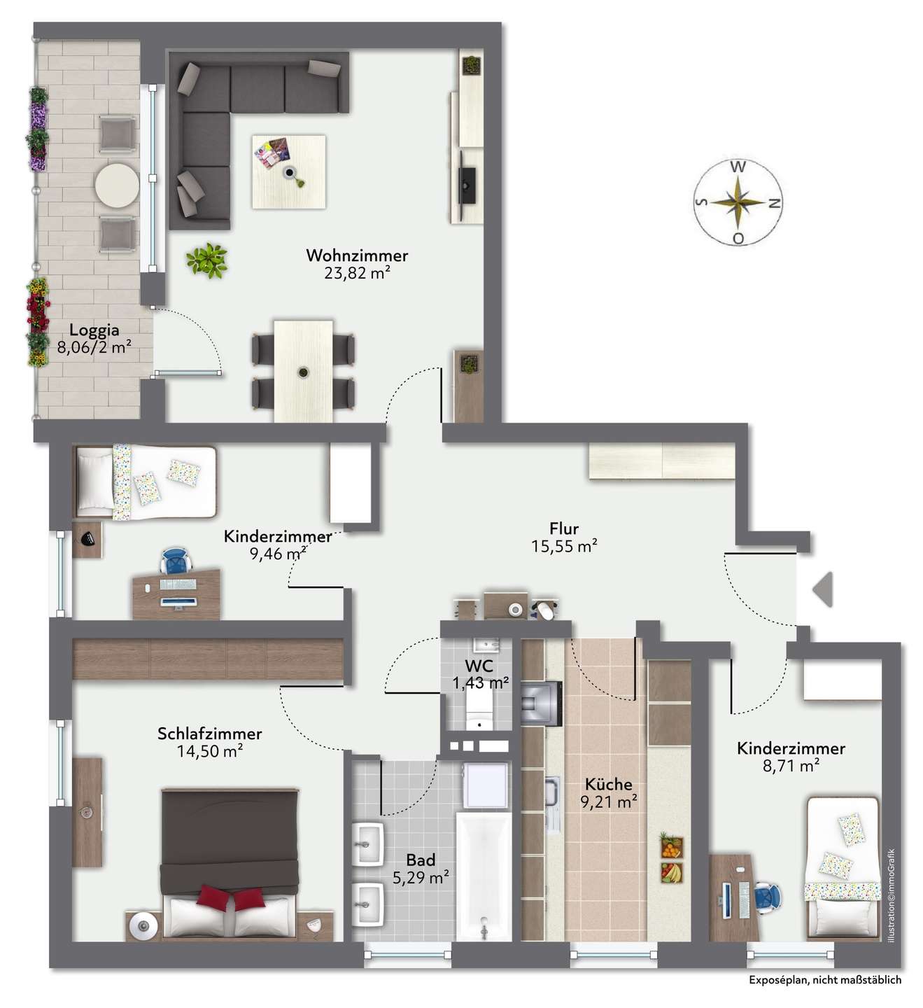 Die Immobilie ist nach Süden und Osten ausgerichtet und befindet sich im 3. Obergeschoss mit Personenaufzug. Sie teilt sich in ein Wohnzimmer, ein Schlafzimmer, zwei Kinderzimmer, eine separate Küche mit Fenster, einen großzügigen Eingangsbereich, ein Tageslichtbad mit Wanne und WM-Anschluss sowie ein separates WC auf. Die große Süd-Loggia mit Markise bietet einen schönen Ausblick.