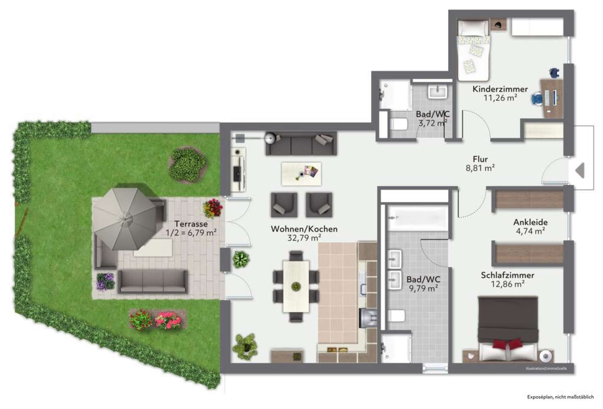 Die Immobilie teilt sich in insgesamt drei Zimmer, zwei Bäder und einen Flur auf. Im sehr hellen Wohnzimmer befinden sich die Küchenzeile und der Zugang zur Terrasse mit eigenem Gartenanteil (Sondernutzungsrecht). Das große Schlafzimmer verfügt über ein Master-Bad en Suite und eine begehbare Ankleide mit Fenster. Derzeit wird die Ankleide als Homeoffice genutzt. Die Wohnung ist ideal ausgerichtet, die Schlafräume zur Nord-Ost-Seite und der Wohn- und Gartenbereich zur Süd-West-Seite.