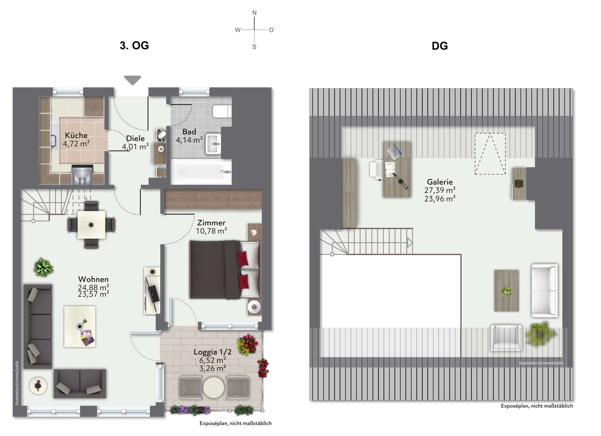 Über den geräumigen Eingangsbereich gelangen Sie sowohl in das Badezimmer und die Küche, jeweils mit Fenster, als auch in den großzügigen Wohnbereich mit beeindruckender Deckenhöhe. Daran angrenzend befindet sich ein Schlaf- oder Arbeitszimmer. Die Loggia ist sowohl vom Wohnzimmer als auch vom Arbeitszimmer aus zugänglich. Die Galerie ist über eine Treppe erreichbar und durch den hohen Kniestock und großflächige Dachfenster ideal nutzbar.
