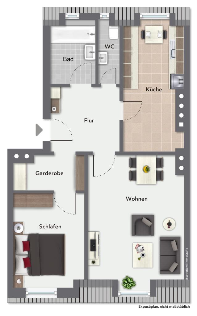 Weiter verfügt die Wohnung auch über eine Garderobe, ein Schlaf- und ein Wohnzimmer, eine Diele, eine großzügige Küche (mit EBK und WA) sowie ein Badezimmer mit Wanne und ein separaten WC. Im UG des Wohnhauses finden Sie das im Sondereigentum stehende Kellerabteil. Die Wohnung und das Gebäude präsentieren sich im gepflegten Zustand mit einer schön eingewachsenen Fassade – ein echter "Hingucker"! Der Innenhof mit kleinem Spielplatz ist ein Ort der Begegnung für die Hausbewohner.