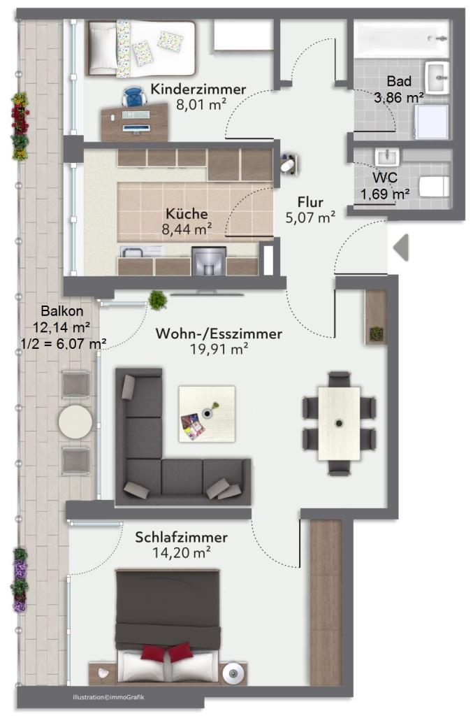 Die Wohnung befindet sich im Hochparterre und teilt sich in ein Wohnzimmer, zwei Schlafzimmer, Küche, Flur, Abstellkammer, Badezimmer mit Badewanne und einem separaten WC auf. Der Südbalkon erstreckt sich über die komplette Breite der absolut hellen Wohnung. Zur Wohneinheit gehört ein Kellerabteil, jedoch kein Tiefgaragenstellplatz. Die vorhandenen Tiefgaragenstellplätze sind im Gemeinschaftseigentum und können angemietet werden. Die Einnahmen stehen der Gemeinschaft zu. Positiv zu erwähnen ist die sehr gute Lage mit ihrer Infrastruktur.