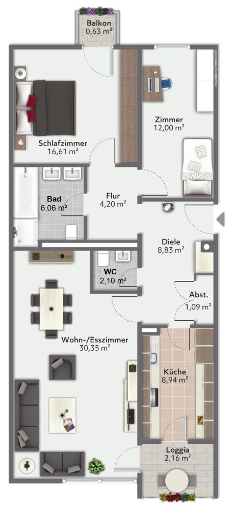Die Wohnung verfügt über eine Diele, die alle Zimmer separat voneinander erschließt. Die Mieter haben das tageslichthelle Wohnzimmer in einen offenen Wohn-/Essbereich mit optisch abgetrenntem Büro umfunktioniert. Die zwei weiteren Zimmer werden als Schlaf- und Kinderzimmer genutzt. Von der Küche und vom Wohnzimmer aus haben Sie Zutritt auf den zum Innenhof ausgerichteten Westbalkon. Das innenliegende Badezimmer ist zeitlos gefliest und mit einer Dusche, einer Wanne und einem Waschmaschinenanschluss ausgestattet. Darüber hinaus verfügt die Wohnung über ein separates Gäste-WC.