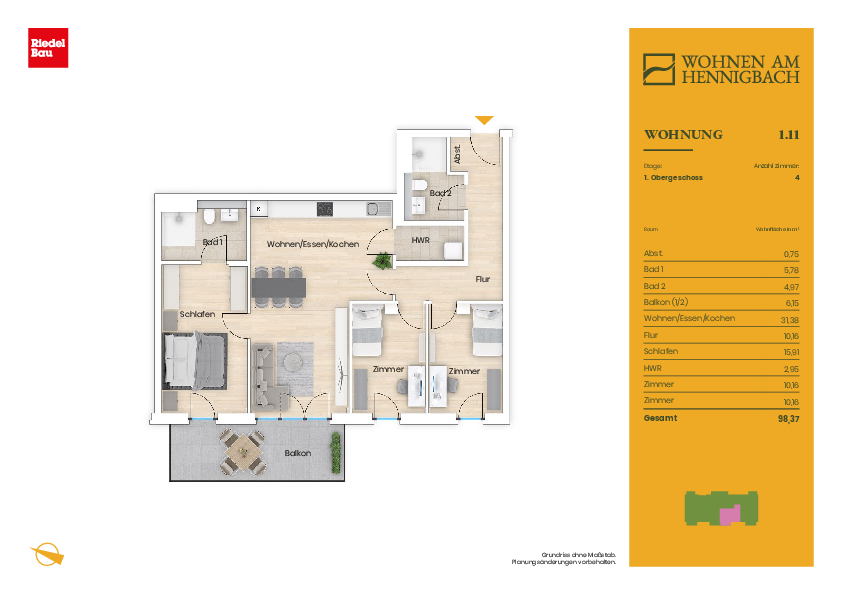 Bei allen Visualisierungen handelt es sich um unverbindliche Darstellungen aus Sicht des Illustrators. Die Grundrisse sind nicht zur Maßentnahme geeignet. Dargestellte Möbel in allen Wohnräumen sowie im Bad und Kücheneinbauten sind beispielhaft.