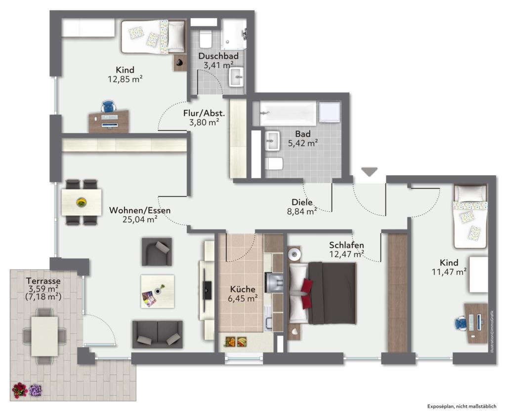 Die gut geschnittene Eck-Wohnung befindet sich im EG eines Wohnhauses aus dem Jahr 2004 innerhalb eines Ensembles mit insgesamt 8 kleinen Mehrfamilienhäusern. Über den Hauseingang erschließen sich insgesamt 11 Einheiten. Die gegenständliche Wohnung besteht aus Wohnzimmer, Schlafzimmer, zwei Kinderzimmern, Küche, Flur sowie zwei Bädern (eines mit Wanne und eines mit Dusche). Vor der Süd-West-Terrasse erstreckt sich der ca. 135 m² große Garten als Sondernutzungsrecht. Zur Wohnung gehören noch ein Kellerabteil sowie für zusätzliche EUR 20.000,- ein Einzelstellplatz in der Tiefgarage. Ein eigener Waschmaschinenanschluss befindet sich im Bad, im UG gibt es ergänzend dazu einen gemeinschaftlichen Trockenraum. Die moderne Wohnung befindet sich in altersgemäßem Zustand, vor Bezug sind daher nur Malerarbeiten sowie eine Überarbeitung oder Austausch der Parkettböden notwendig.