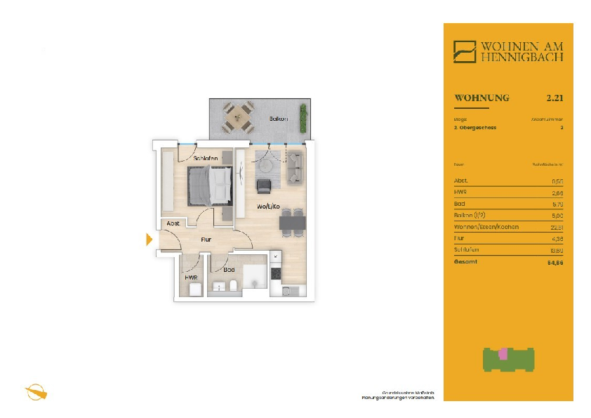 In dem ortsbekannten Neubauprojekt „Wohnen am Hennigbach“ erwartet Sie diese moderne und nahezu barrierefreie 2-Zimmer-Wohnung mit ca. 54,86 m² Wohnfläche. Die Wohnung überzeugt durch eine durchdachte Raumaufteilung, eine offene Wohnküche sowie hochwertige Ausstattungsdetails.Der lichtdurchflutete Wohn- und Essbereich mit offener Küche bildet das Herzstück der Wohnung und hat direkten Zugang zum sonnigen Ostbalkon – ideal zum Entspannen und Genießen. Große Fensterflächen sorgen für eine angenehme Wohnatmosphäre und viel Tageslicht.