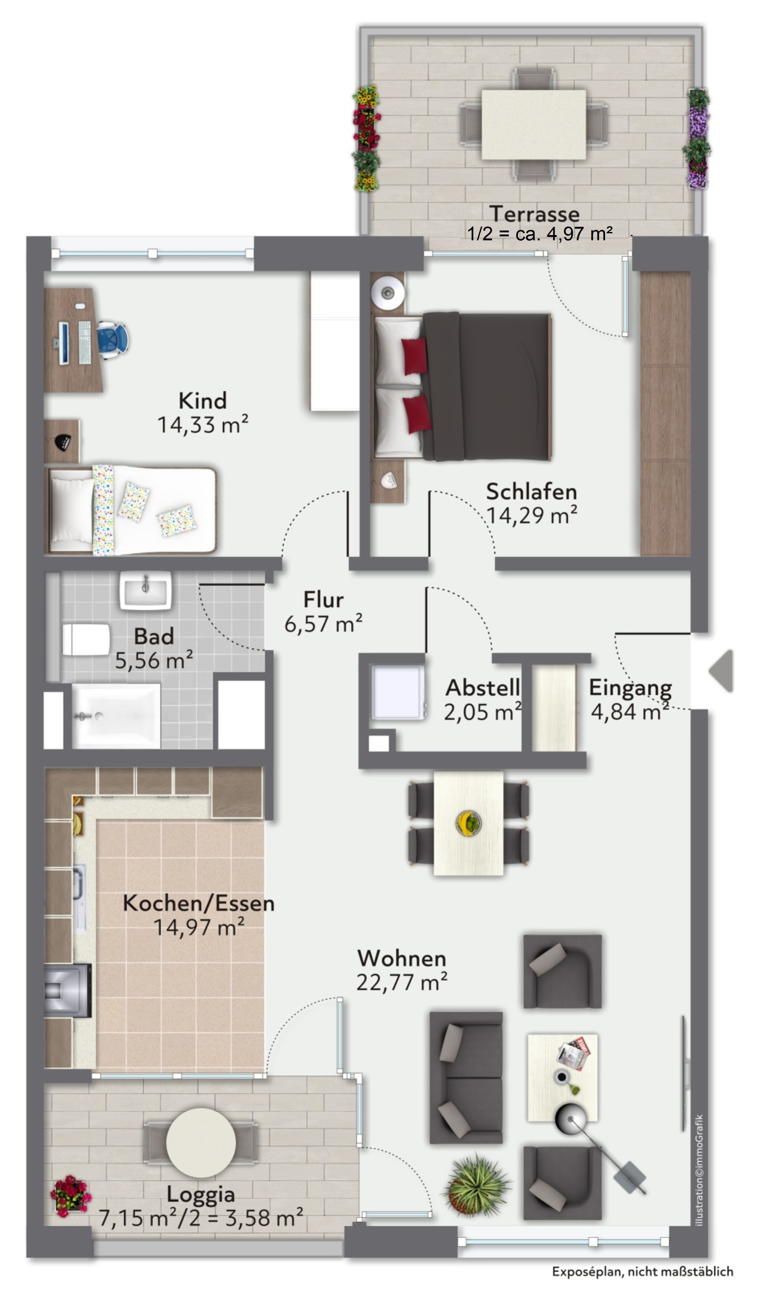 Die Wohnung ist ideal dimensioniert und bietet deshalb clevere Stellmöglichkeiten. Von der Eingangstür kommend betreten Sie den Flur, der alle Zimmer (Wohnzimmer mit offener Küche, Schlafzimmer und Büro/Kinderzimmer) und die anderen Räume (Vorratskammer und Bad) separat voneinander erschließt. Das Wohnzimmer ist nach Südosten hin ausgerichtet. Von hier aus gelangen Sie auf die sonnige Loggia mit Blick in den gepflegten, ruhigen Innenhof mit Kinderspielplatz. Über das Schlafzimmer gelangen Sie auf die einzigartige Nordwest-Terrasse, die im Sommer für Urlaubsflair und zum Ausklingen nach einem harten Arbeitstag mit einem schönen Sonnenuntergang einlädt. Das geflieste Badezimmer ist mit einer bodengleichen Glasdusche, einem Handtuch-Heizkörper sowie einem stilvollen Designer-Waschbecken ausgestattet. Den Waschmaschinen-anschluss finden Sie in der praktischen Abstellkammer des Flurs mit ausreichend Platz für weiteren Stellraum, wie z. B. Essensvorräte, Staubsauger, zusätzliche Gefriertruhe u.v.m. Die Küche begeistert mit einer hochwertigen EBK (teilweise mit Garantie). Durch den nahtlosen Übergang vom Koch-/Essbereich zum Wohnzimmer kann auch während eines Besuchs gemütlich gekocht und sich simultan unterhalten werden. Die stilvolle Designer-Steinwand im Wohnzimmer dient als optisches Highlight dieser traumhaften Immobilie und lässt sich mit unzähligen Einrichtungsvariationen kombinieren, während sie für eine moderne und gemütliche Wohnatmosphäre sorgt.