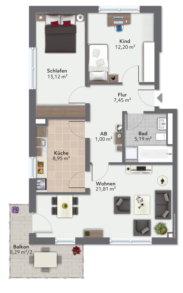 Die Wohnung befindet sich im 2. Obergeschoss ohne Personenaufzug. Die Einheit teilt sich in ein Wohnzimmer, 2 Schlafzimmer, Küche, innenliegendes Bad und Flur auf. Das Wohnzimmer ist nach Süd-West ausgerichtet, die Schlafzimmer nach Nord-Ost und Nord-West. Vom Wohnzimmer aus gelangen Sie auf den Eckbalkon. Die Wohnung ist seit 2010 vermietet und wird mit Wirkung zum 01.07.2022 frei. Die Wohnung befindet sich in einem zeitgemäßen Zustand, kleinere Schönheitsreparaturen, wie z. B. ein neuer Boden, wären sicherlich sinnvoll.