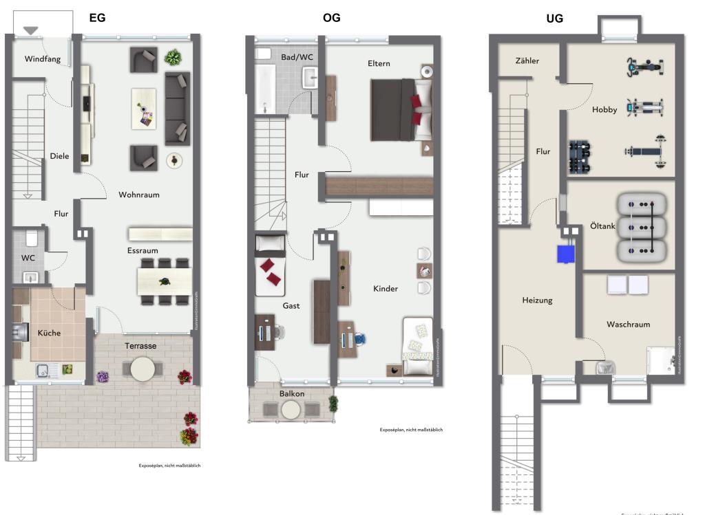 Im Untergeschoss sind ein Anschlussraum, ein Hobbyraum, ein Öltankraum, ein Heizungskeller mit Außentreppe zum Garten sowie ein Waschraum mit Dusche angeordnet.