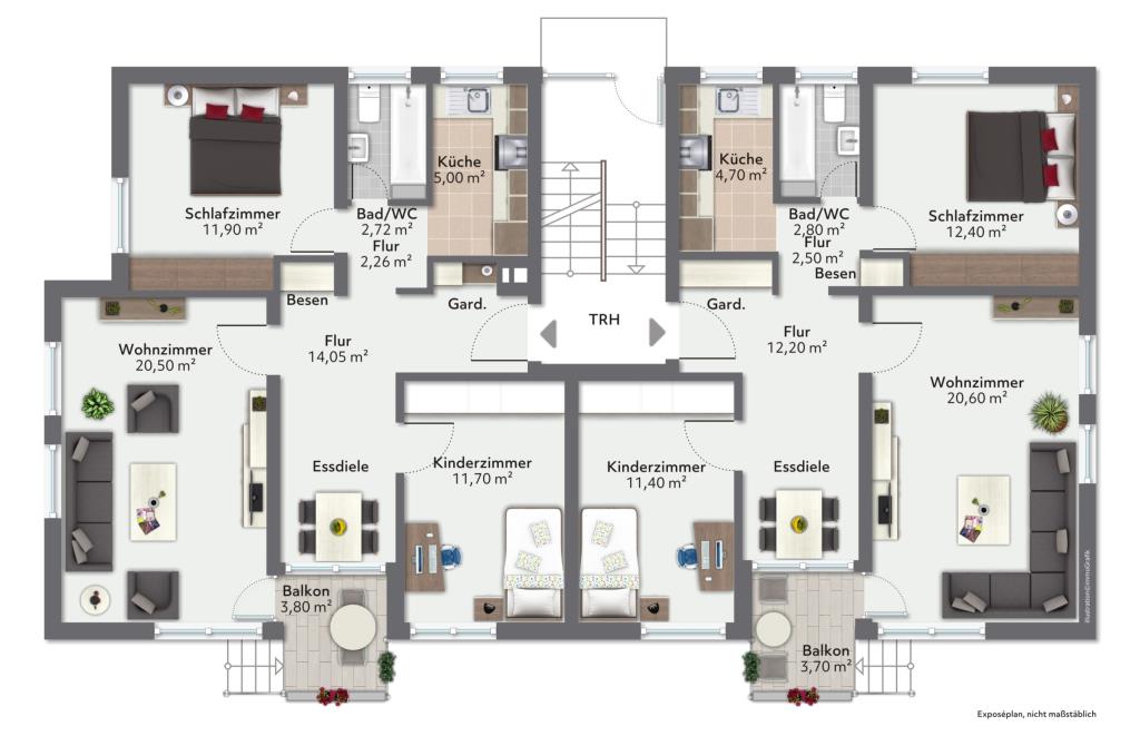 Die sechs Wohnungen verteilen sich innerhalb des Objektes auf, je zwei Wohnungen im Hochparterre, 1. Obergeschoss und 2. Obergeschoss. Die Wohnungen liegen beidseitig vom Treppenhaus jeweils mit identischem Grundriss (Ost/West gespiegelt), lediglich im DG weichen die Grundrisse voneinander ab. Vor dem Haus im Süden gibt es einen kleinen Gemeinschaftsgarten. Über die Zufahrt im nördlichen Teil, sind die zwei Einzelgaragen erreichbar. An dieser Zufahrt besitzen die Häuser östlich des Mehrfamilienhauses ein Geh- und Fahrtrecht.