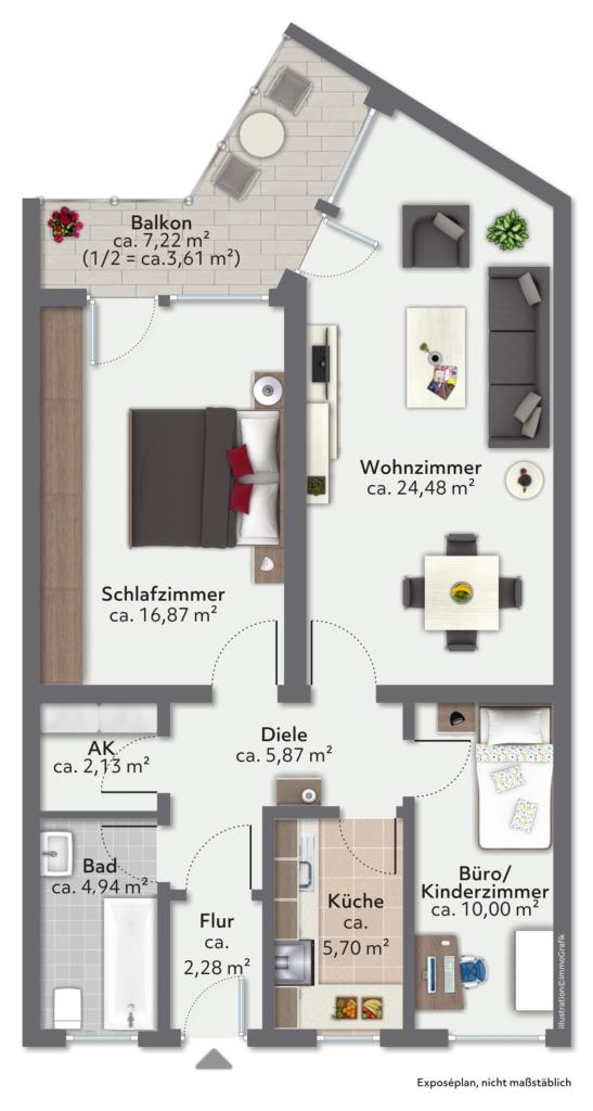 Die Räume sind optimal dimensioniert und durch die Ausrichtung tageslichthell und freundlich. Die Immobilie verfügt über ein Schlafzimmer, einen großen Wohnbereich, ein Kinderzimmer/Büro, eine Küche, eine Diele, ein Wannenbad und eine Abstellkammer. Über den Wohnbereich und das Schlafzimmer gelangen Sie auf den Westbalkon zum grünen Innenhof. Zur Wohnung gehören ein Kellerabteil sowie ein Einzelstellplatz in der Tiefgarage.