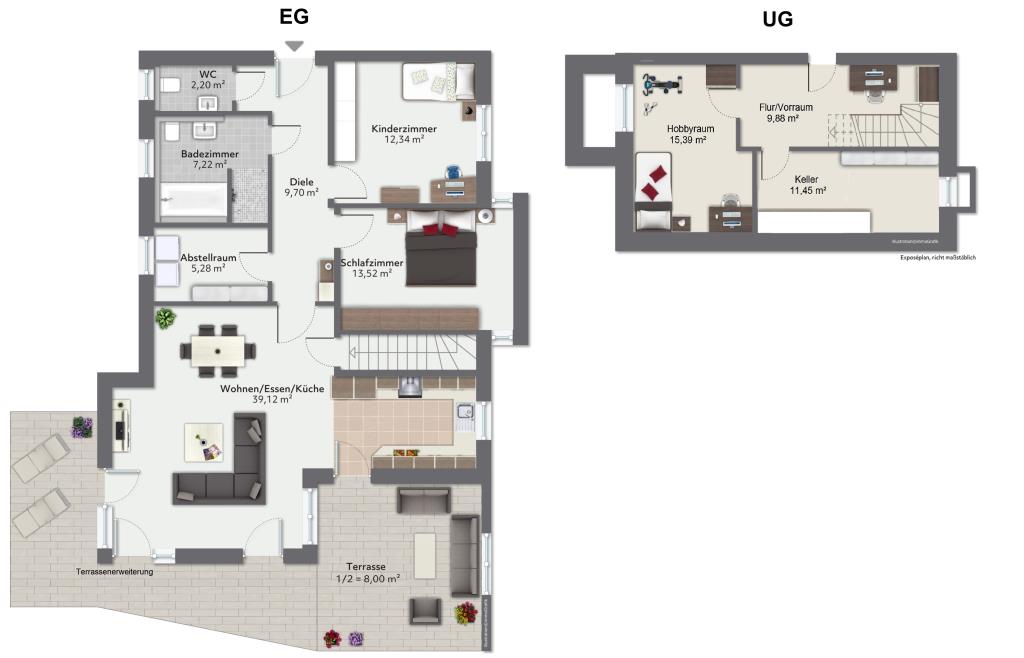 Über eine innenliegende Treppe (durch eine Tür vom Wohnraum abgetrennt) gelangt man in den unteren Teil der Wohnung. Hier befinden sich ein Flur, der ausreichend für einen kleinen Arbeitsplatz ist, ein klassischer Kellerraum sowie der Hobbyraum. Durch eine Abböschung verfügt der Hobbyraum über ausreichend Tageslicht und ist mit der Hälfte der Fläche beim Wohnraum berücksichtigt. Über eine Tür gelangt man zu den Gemeinschaftsflächen (Heizung, Zählerraum usw.).