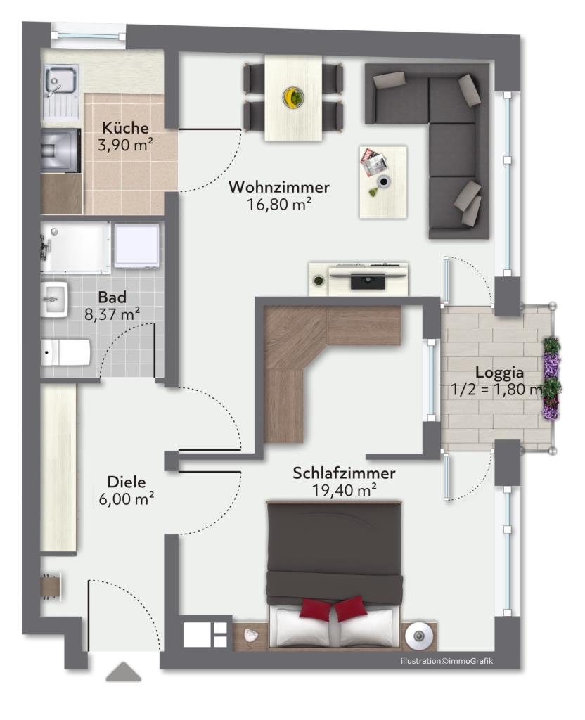 Die Wohnung befindet sich im Hochparterre und teilt sich in ein Wohnzimmer, ein Schlafzimmer, eine separate Küche, einen Flur und einem Badezimmer auf. Die Ost-Loggia ist vom Wohnzimmer als auch vom Schlafzimmer begehbar.