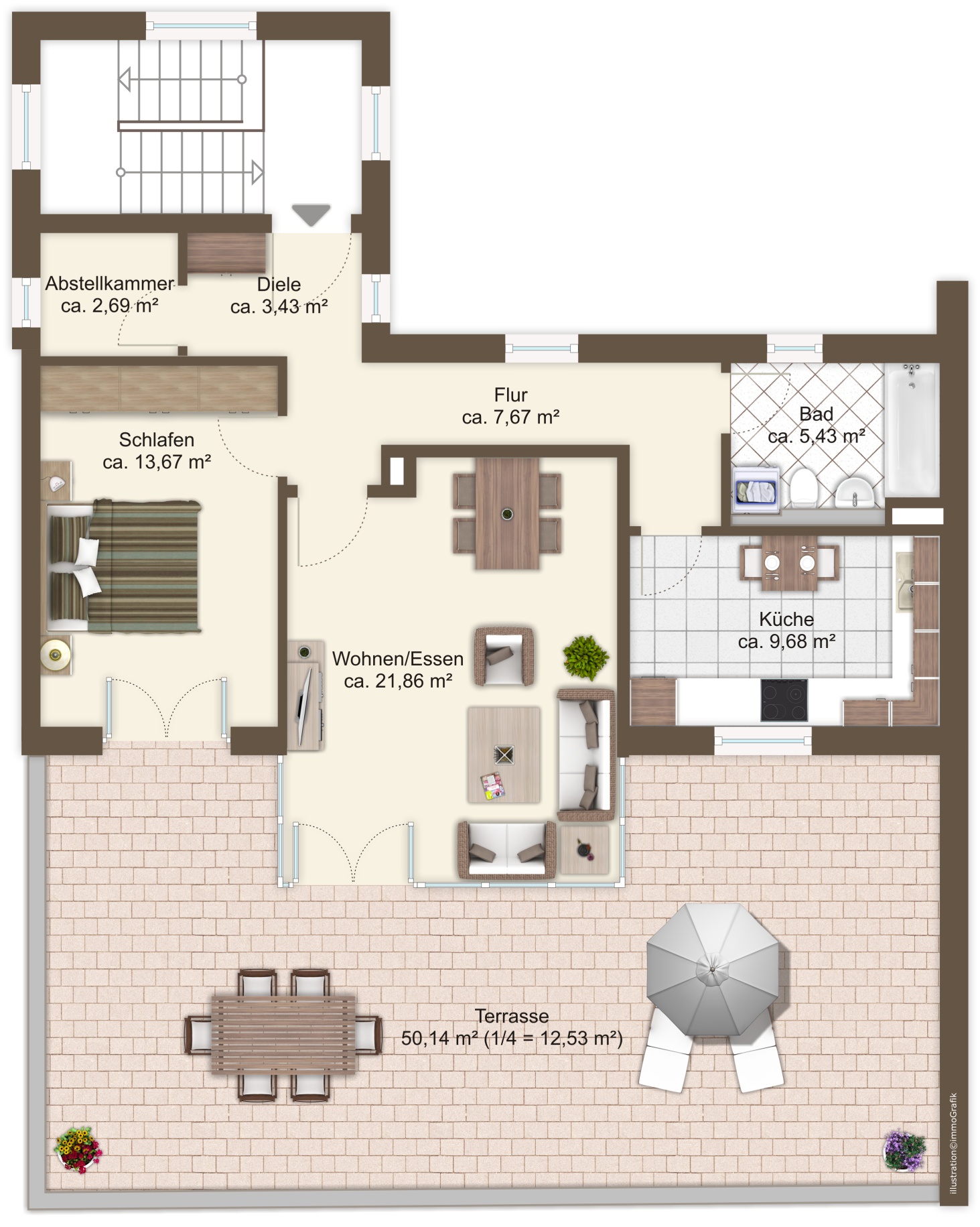 - ca. 50 m² Süd-West-Dachterrasse