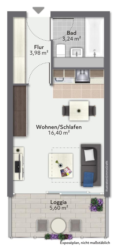 Die Diele mit Abstellnische erschließt das Wannenbad sowie den Wohn-/Schlafraum mit Küchenzeile. Die ca. 5,60 m² große Loggia ist ostseitig ausgerichtet und bietet einen angenehmen Grünblick.