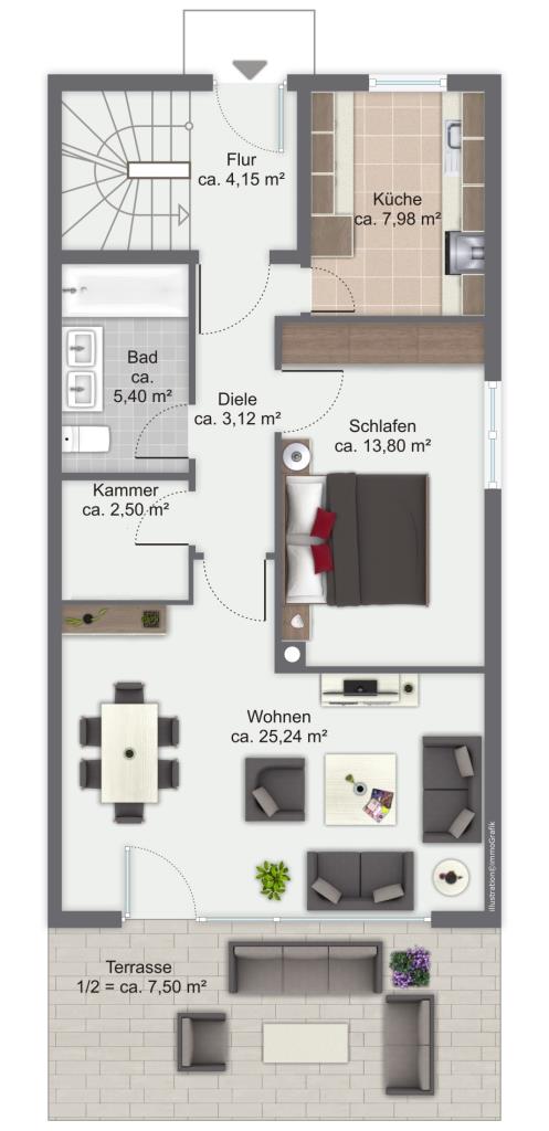 Die 2-Zimmer-Gartenwohnung im EG steht derzeit leer und Bedarf einer umfänglichen Renovierung. Die baugleiche Wohnung im 1. OG ist seit über 20 Jahren an eine Dame vermietet und befindet sich in einem guten Zustand. Über eine innenliegende Wendeltreppe gelangt man in den ausgebauten Speicher. Genehmigte Pläne zum DG liegen nicht vor. Mit der Mieterin wurde kein schriftlicher Mietvertrag geschlossen, lediglich eine mündliche Vereinbarung. Die monatliche Kaltmiete liegt derzeit bei EUR 613,55 (inkl. Garage) zzgl. EUR 102,26 Nebenkostenvorauszahlung.